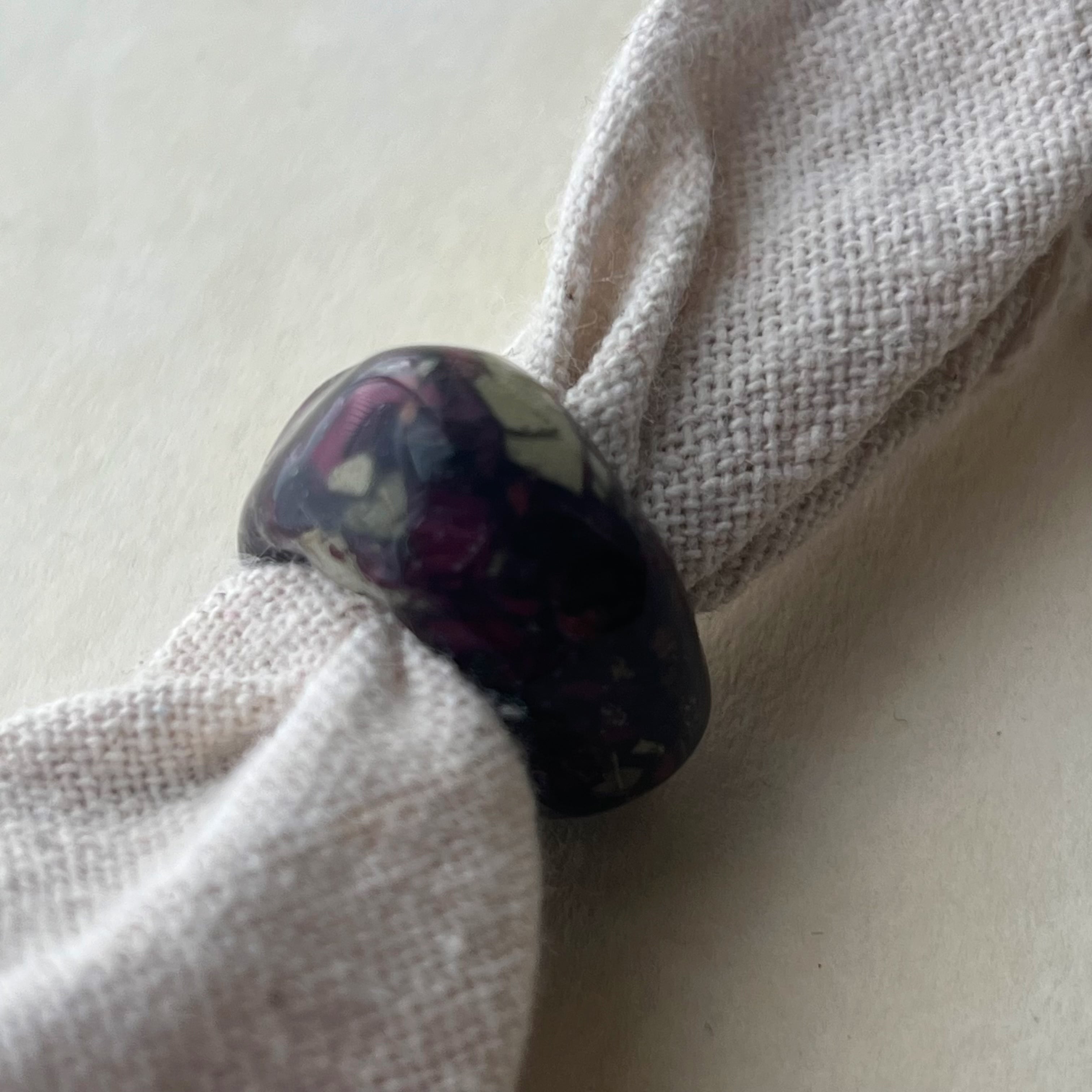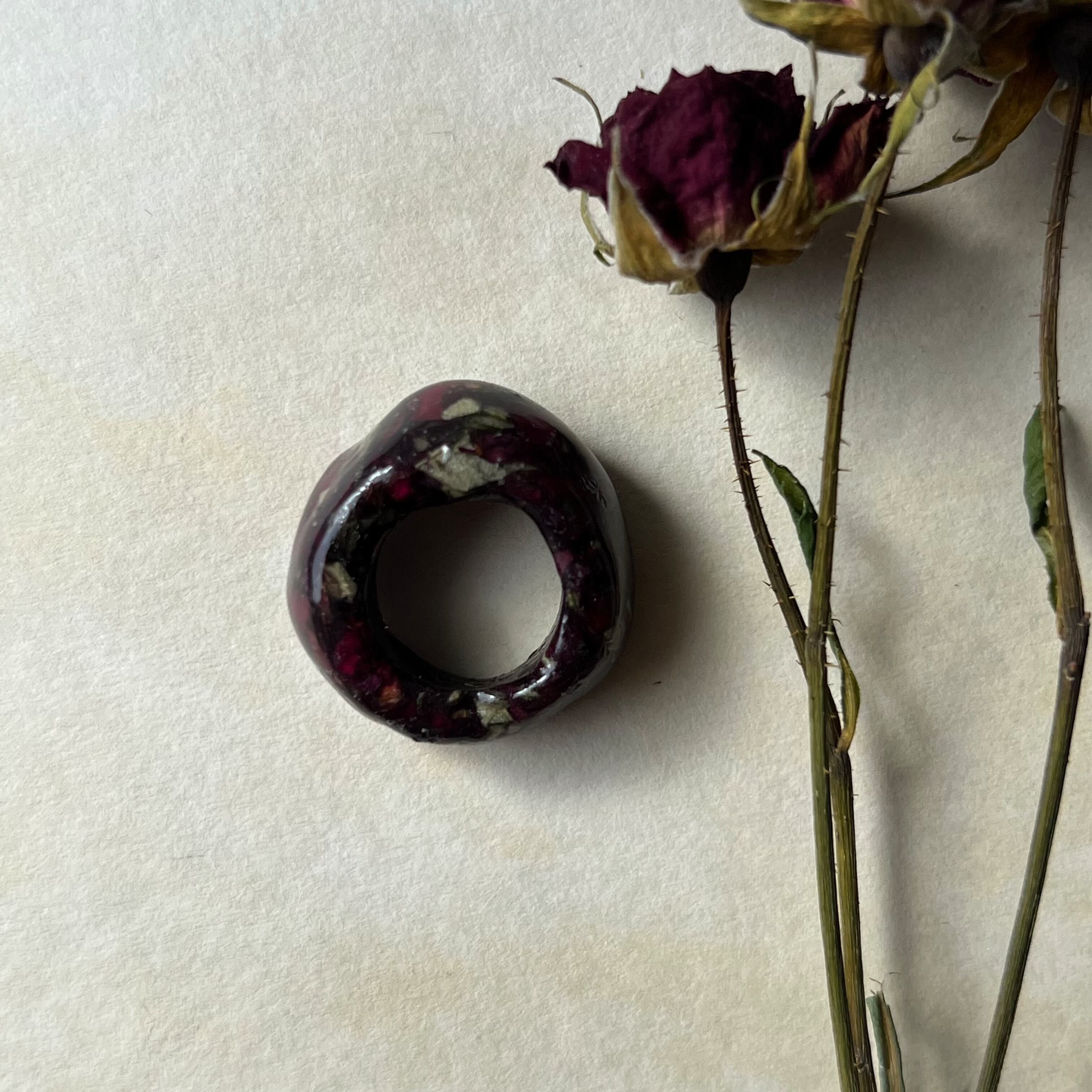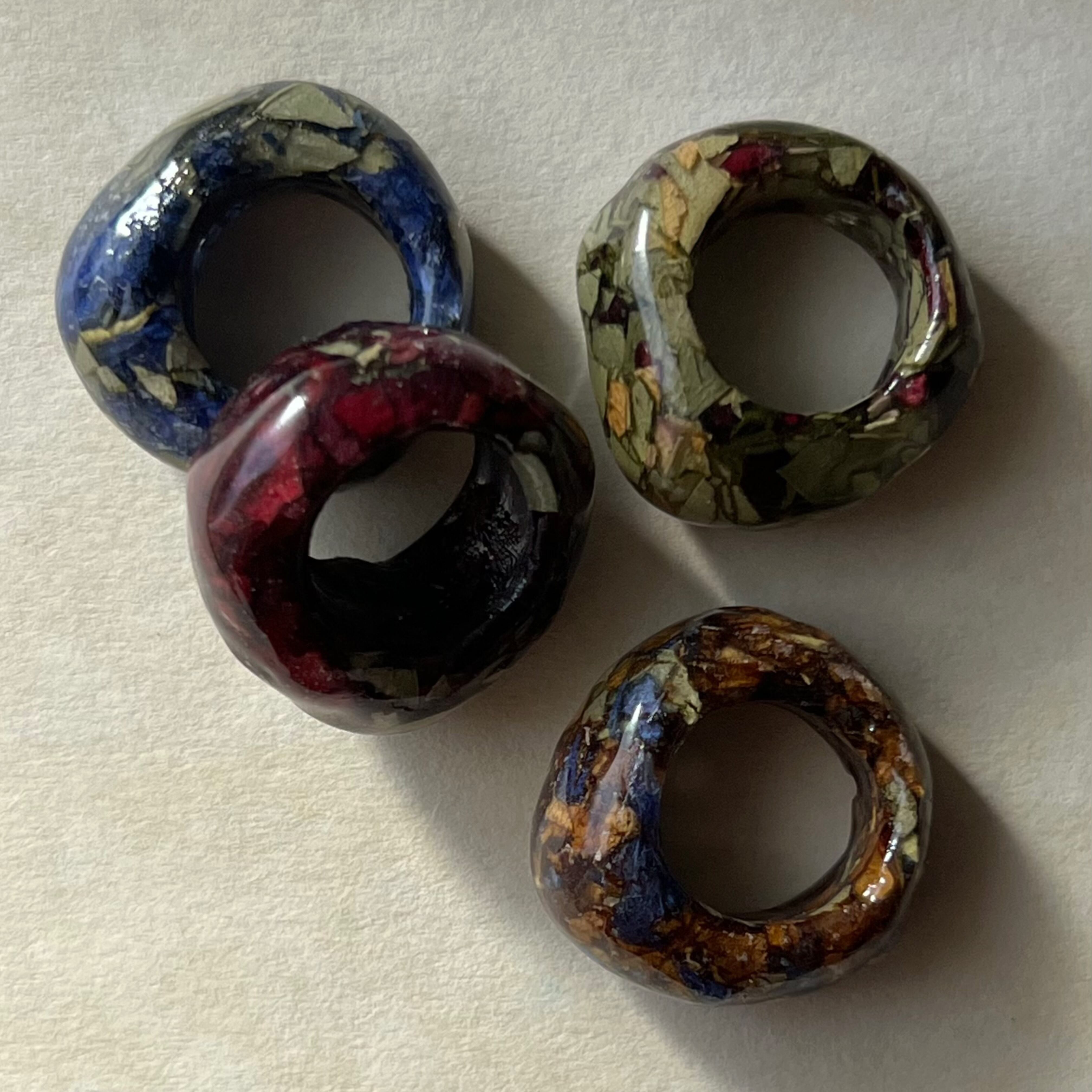 花びらや葉を閉じ込め、ひとつひとつ異なる表情を見せるぷっくりフォルムのリング。