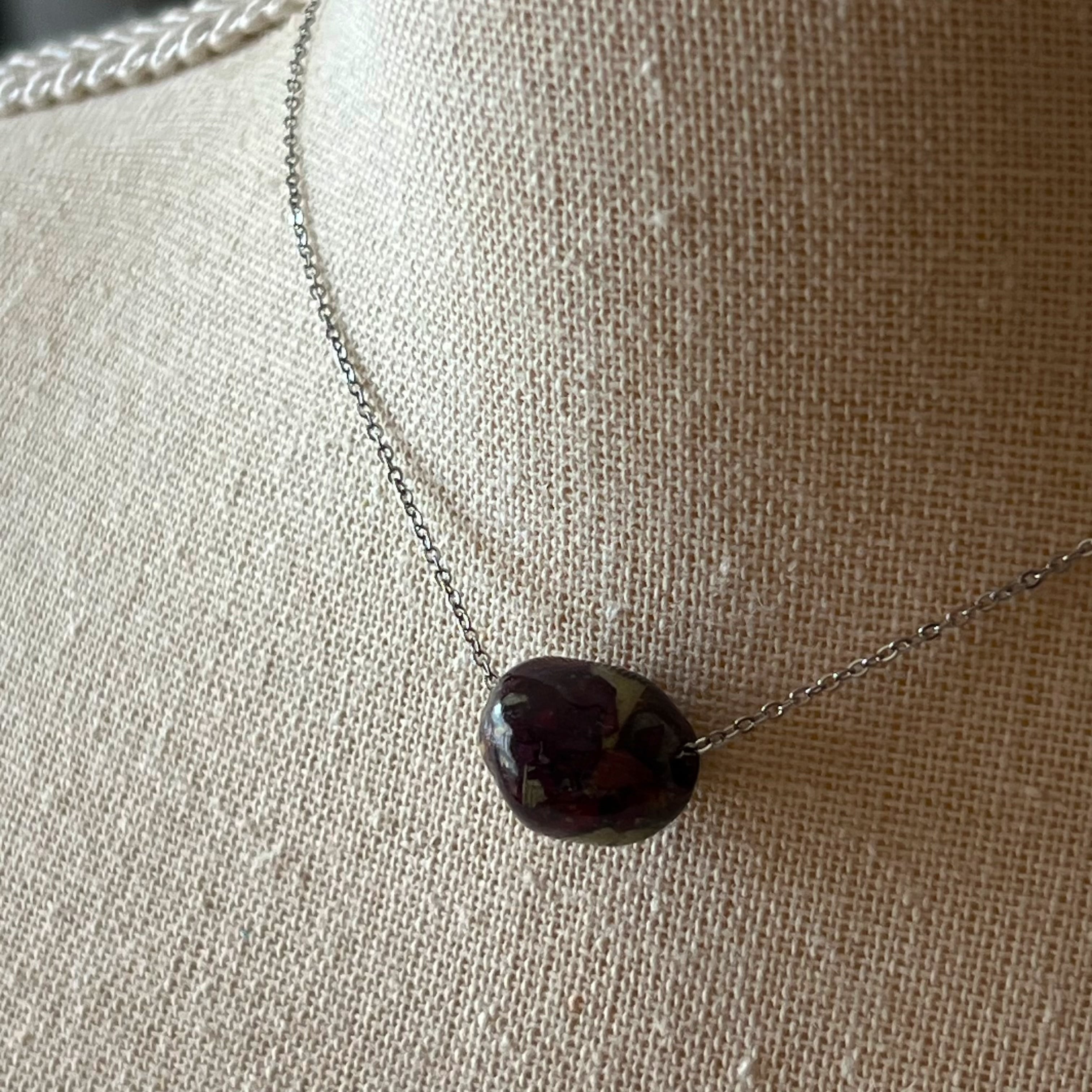 まるで大地から生まれた天然石のように、花びらや葉を閉じ込めて形作ったネックレス。