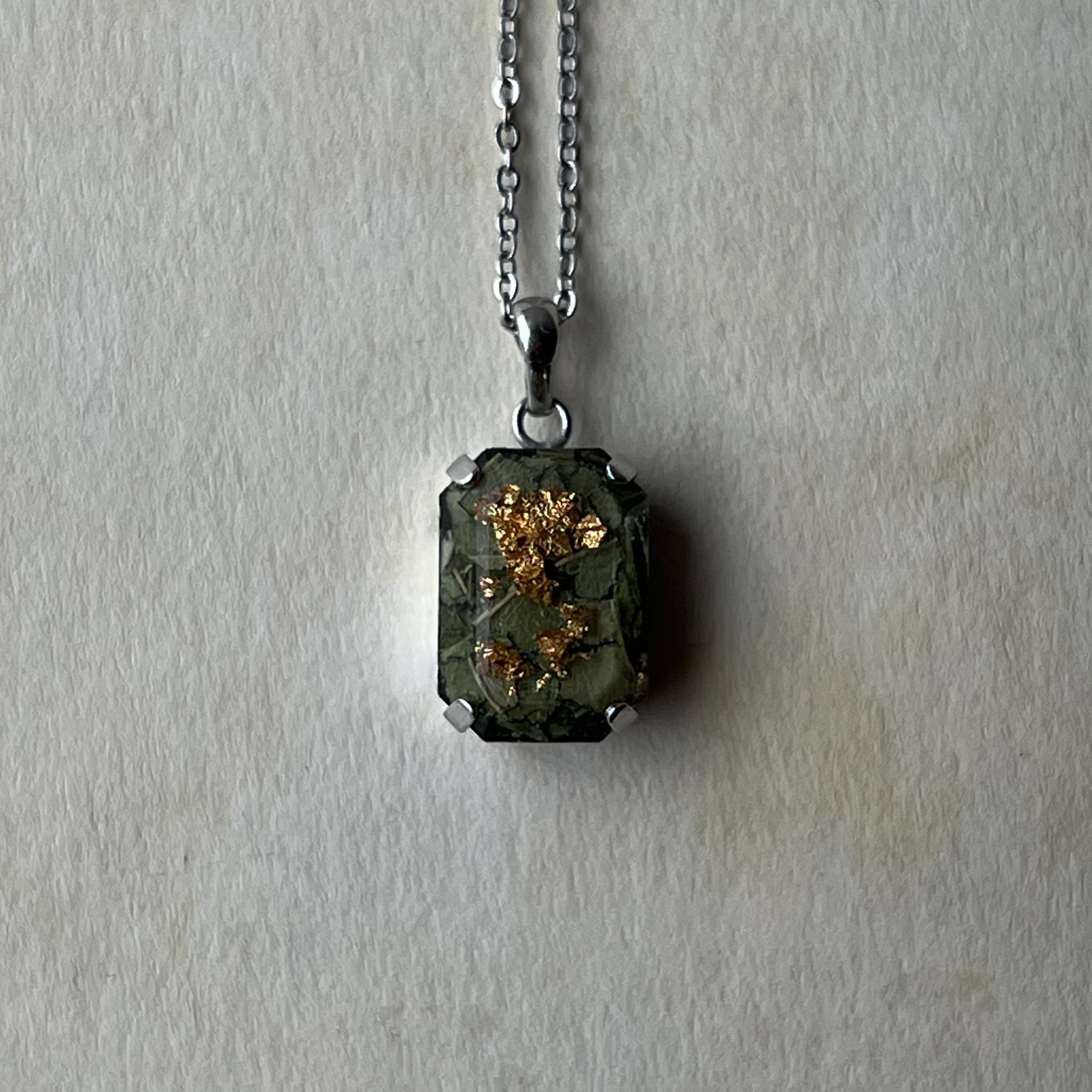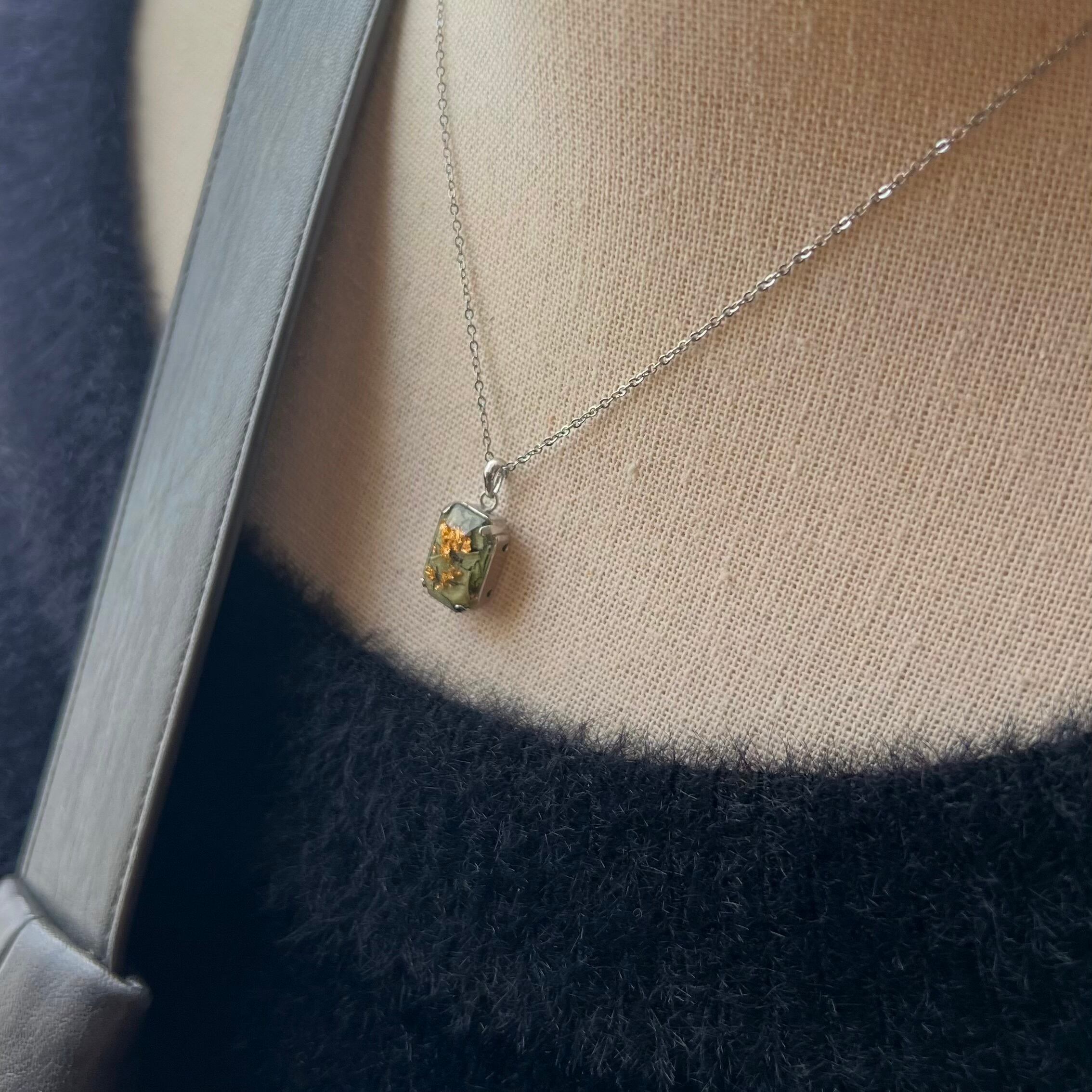 花びらをぎゅっと閉じ込めた、静かに輝くネックレス。 透明感のある樹脂の中で、自然の色彩と煌めきがひとつになり、 身につけるたびにささやかな特別感を添えてくれます。 長さ:40cm チャーム部分:14×10mm 素材:ステンレス(チェーン部分) 合金(留具,接合部)ドライフラワー 樹脂 メタリックホイル(金属調フィルム)