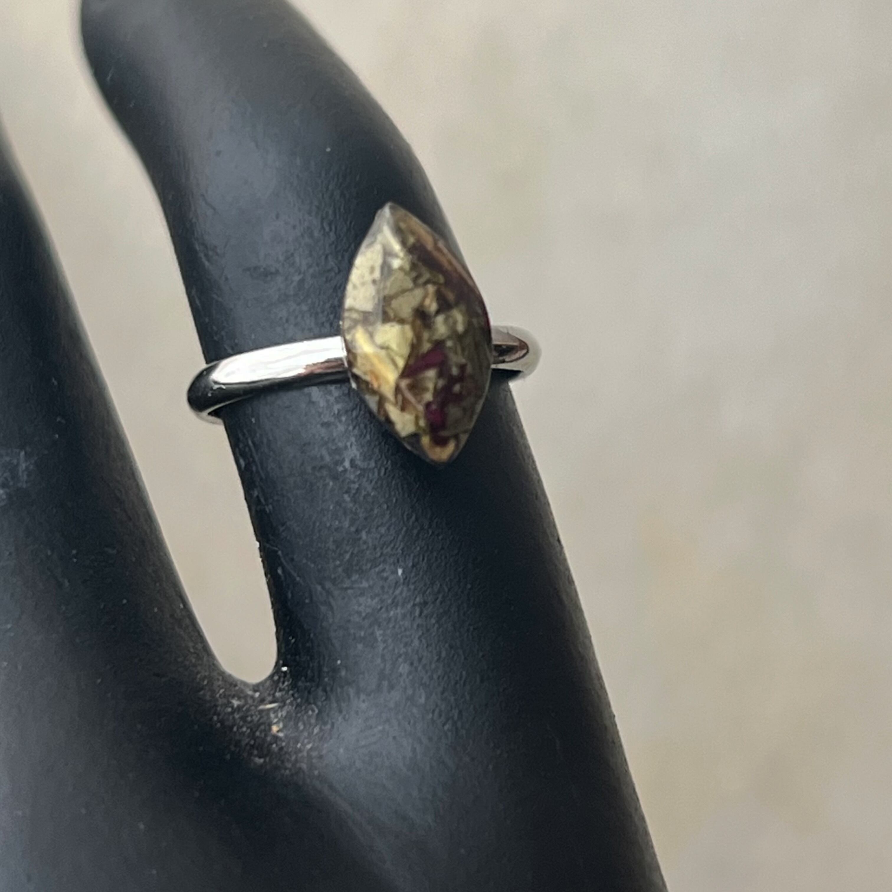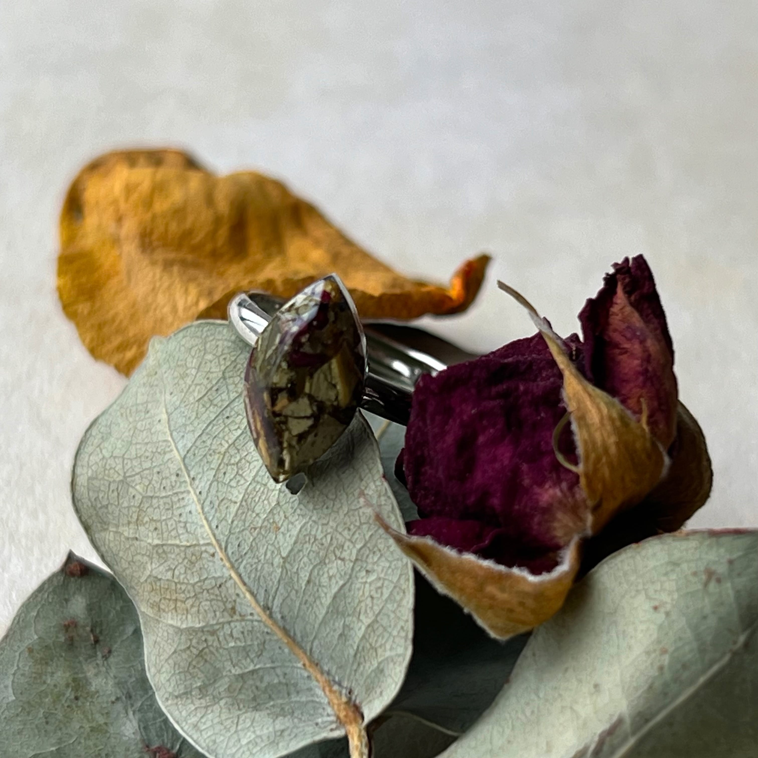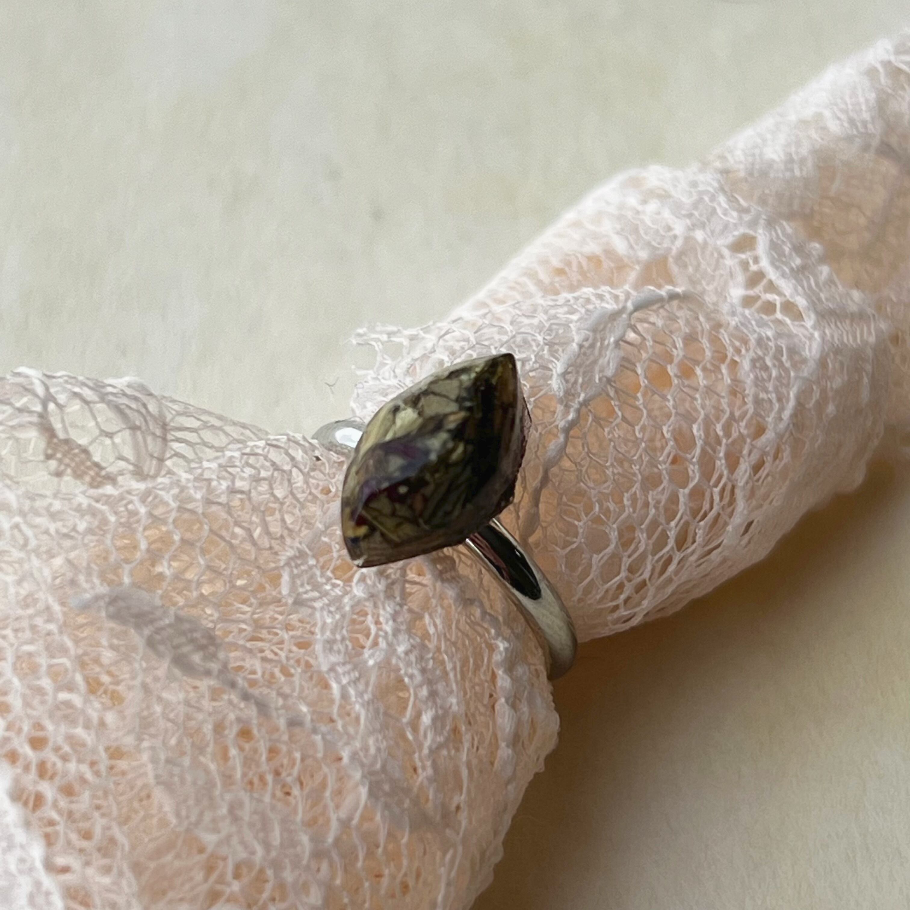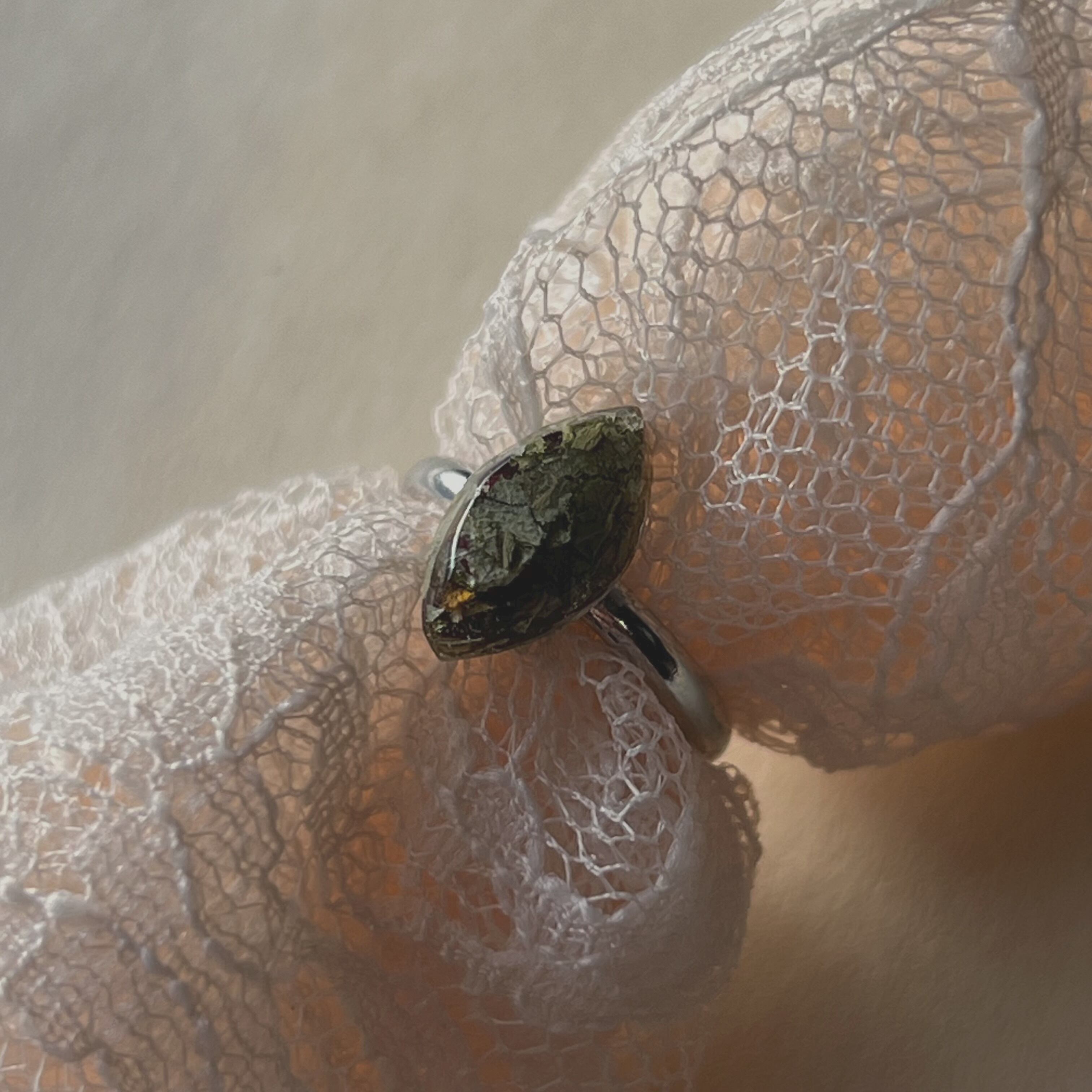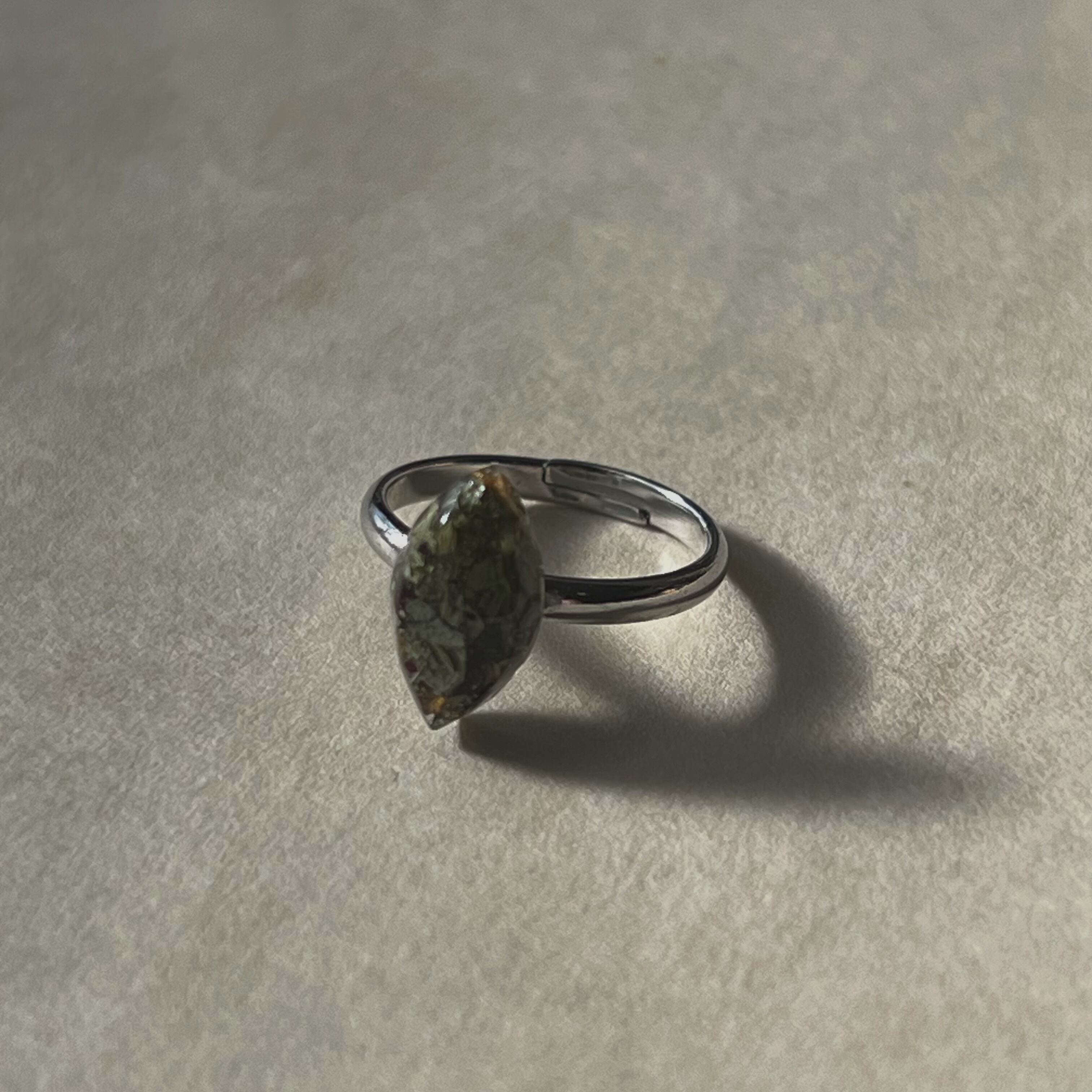 花を閉じ込めて生まれた特別なフォルムが、天然石のような奥行きを感じさせるピンキーリング。