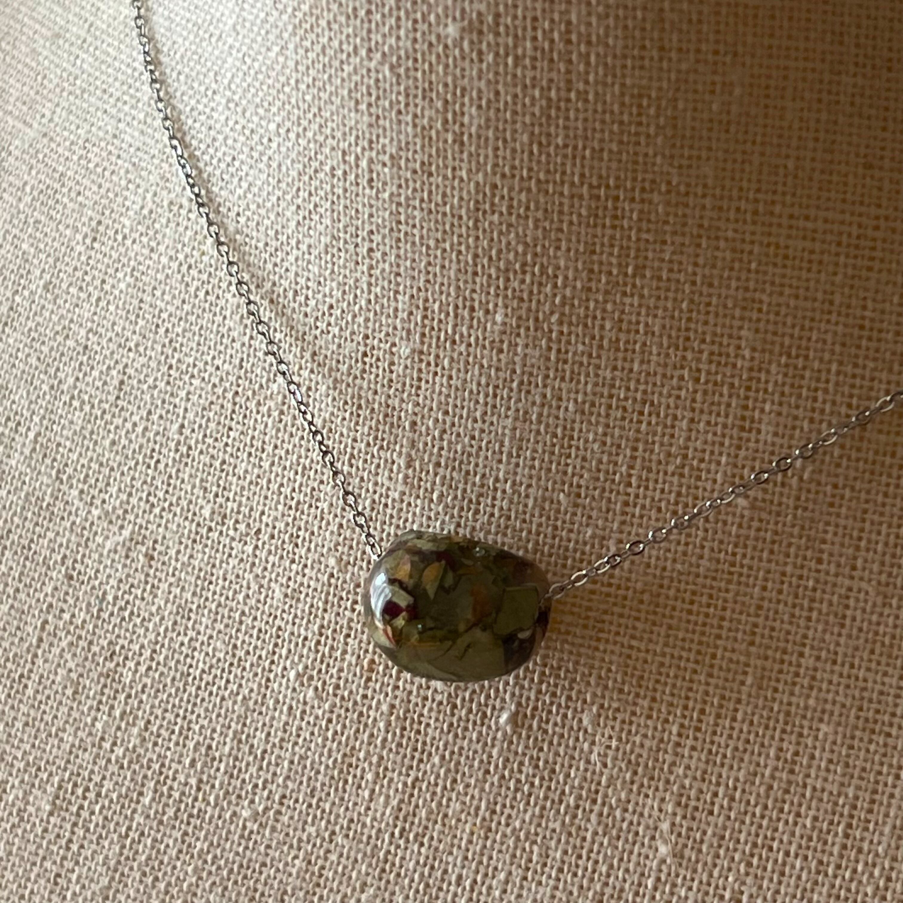 まるで大地から生まれた天然石のように、花びらや葉を閉じ込めて形作ったネックレス。