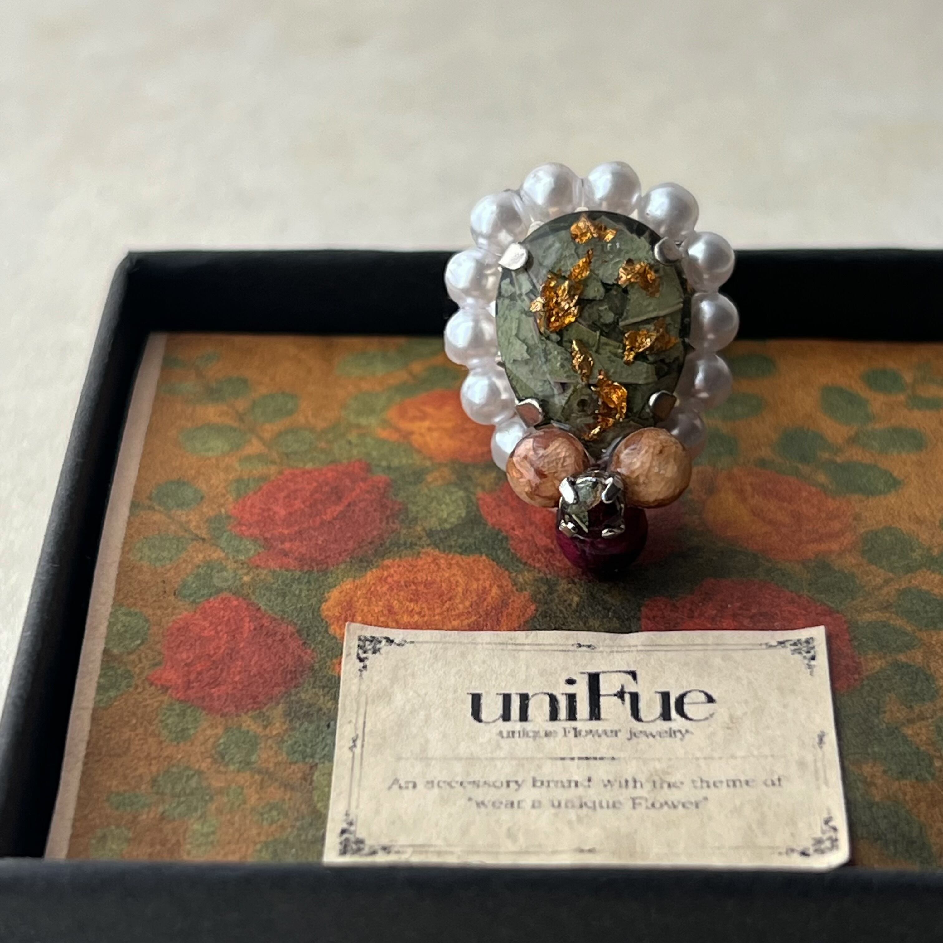 花そのものをビジューに変えるuniFueならではのアクセサリー。ひとつひとつ異なる表情が、あなただけの特別な輝きを演出します。
