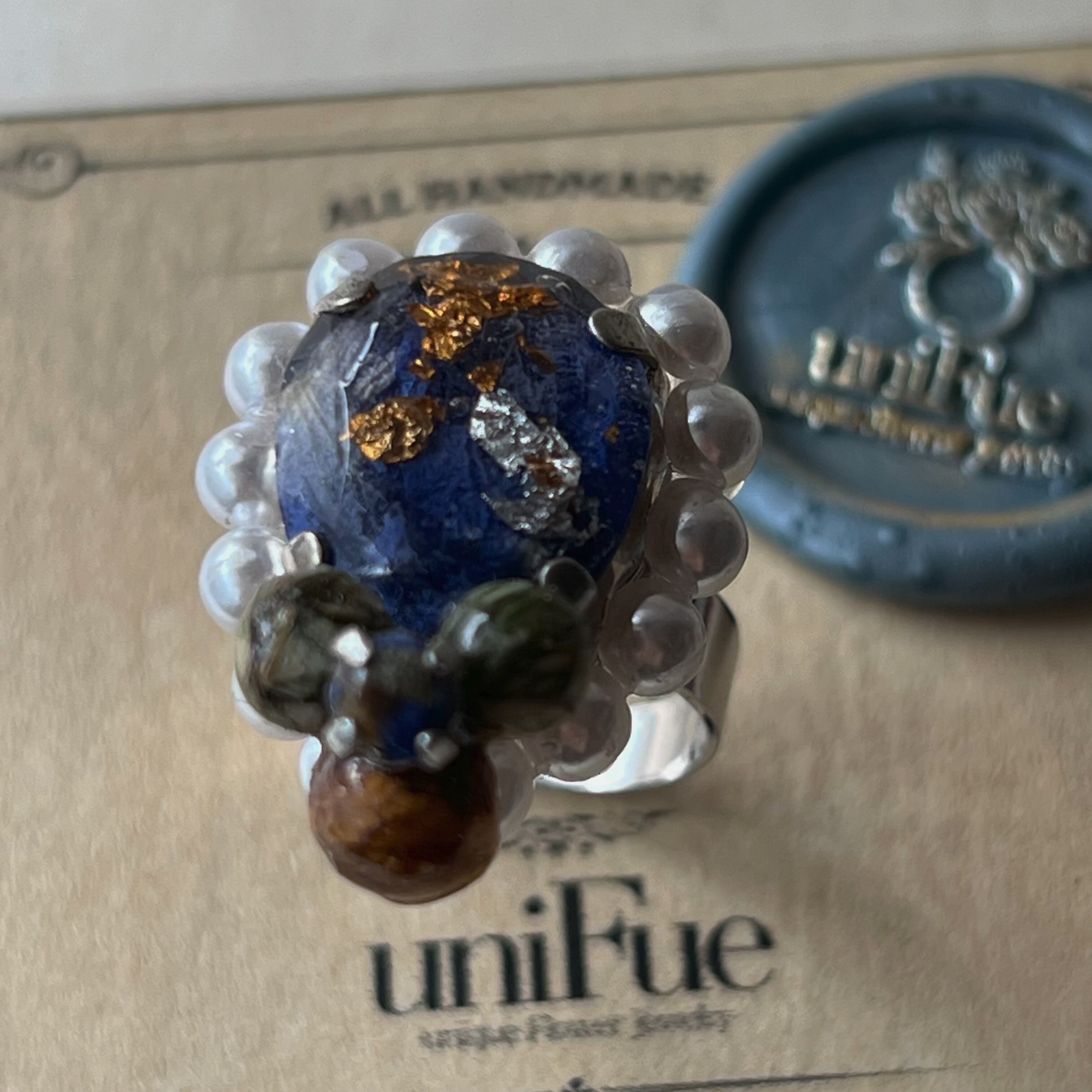 花びらを重ねて生み出した唯一無二のフォルムに、繊細なパールを添えて仕立てたリング。 まるで小さな花の冠を手元に飾るように、気品と可憐さをあわせ持つデザインです。 花そのものをビジューに変えるuniFueならではのアクセサリー。ひとつひとつ異なる表情が、あなただけの特別な輝きを演出します。 素材:ステンレス(リング部分) 樹脂 ドライフラワー レジンパール 合金 号数:フリー (金具で調節できます)