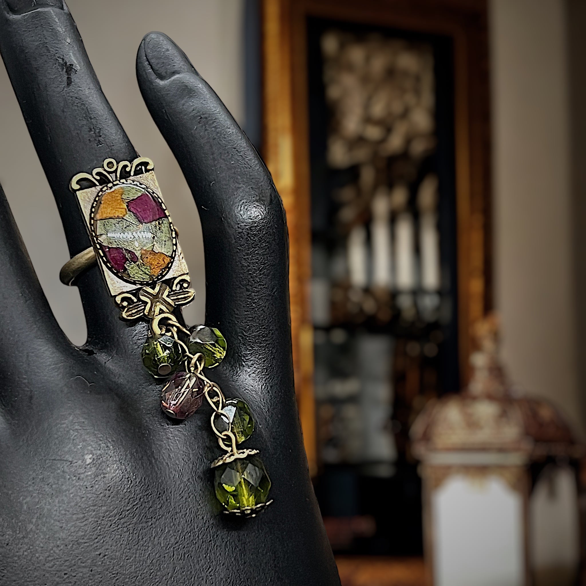 キラリと光るチェコガラスを連ねた個性派なデザインの指輪です。