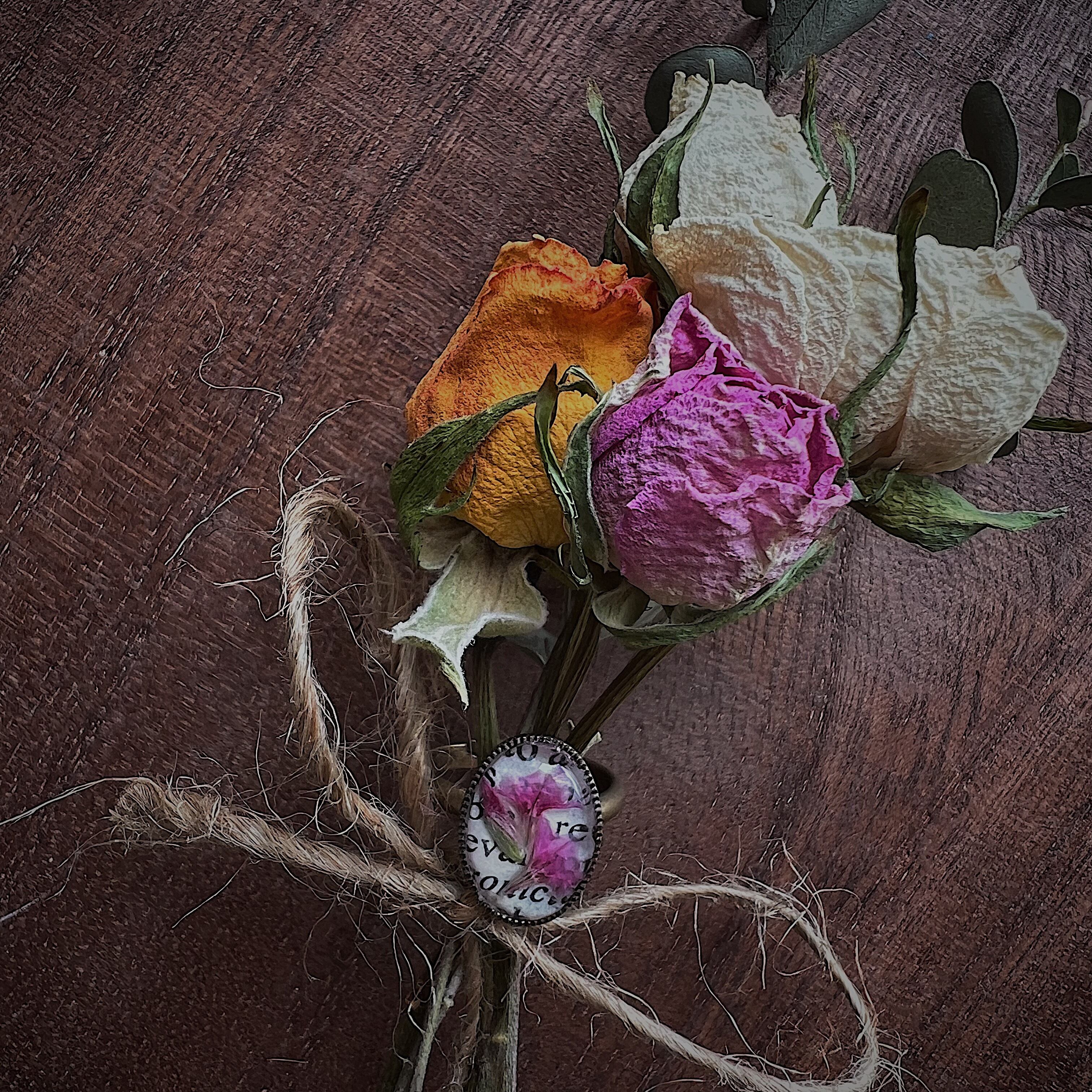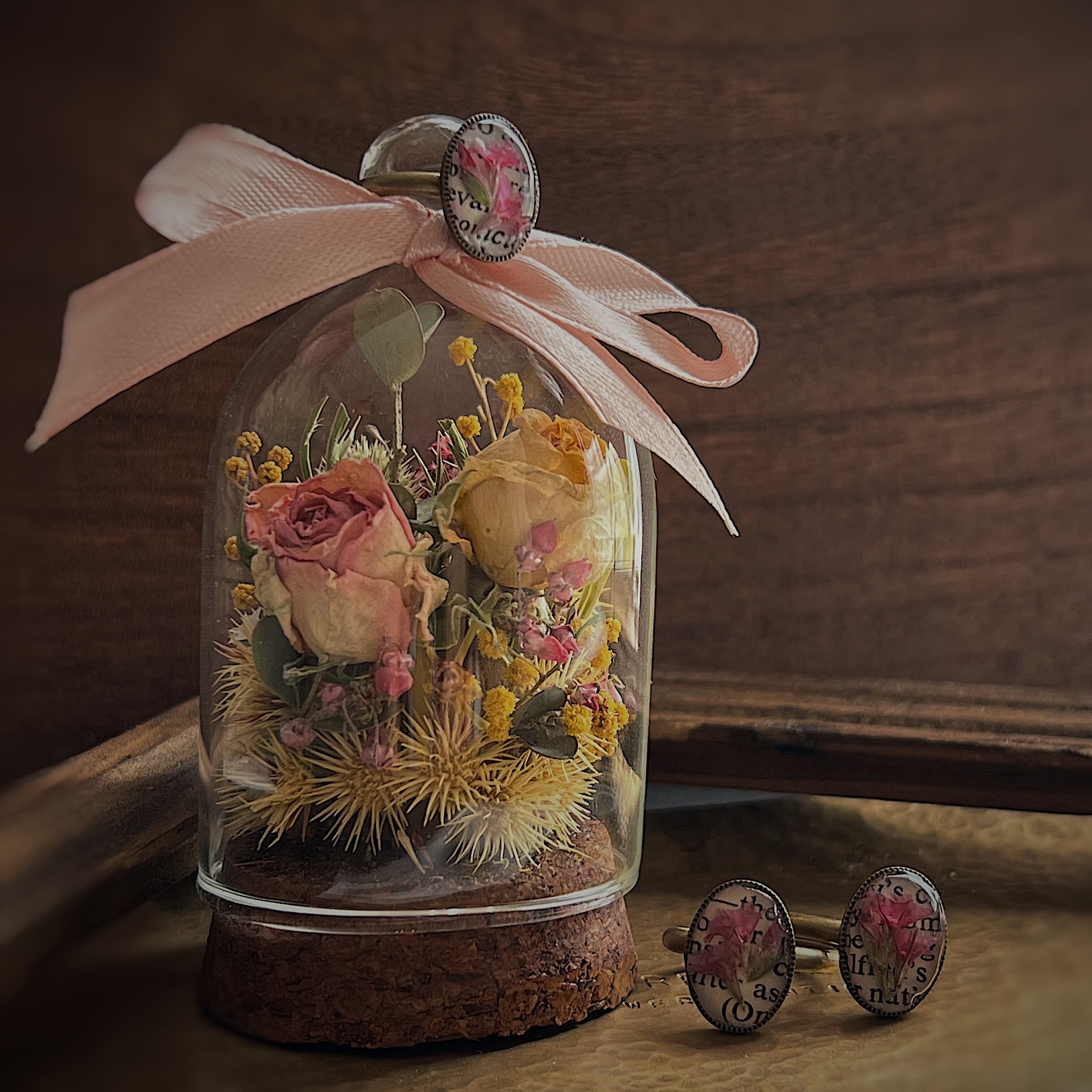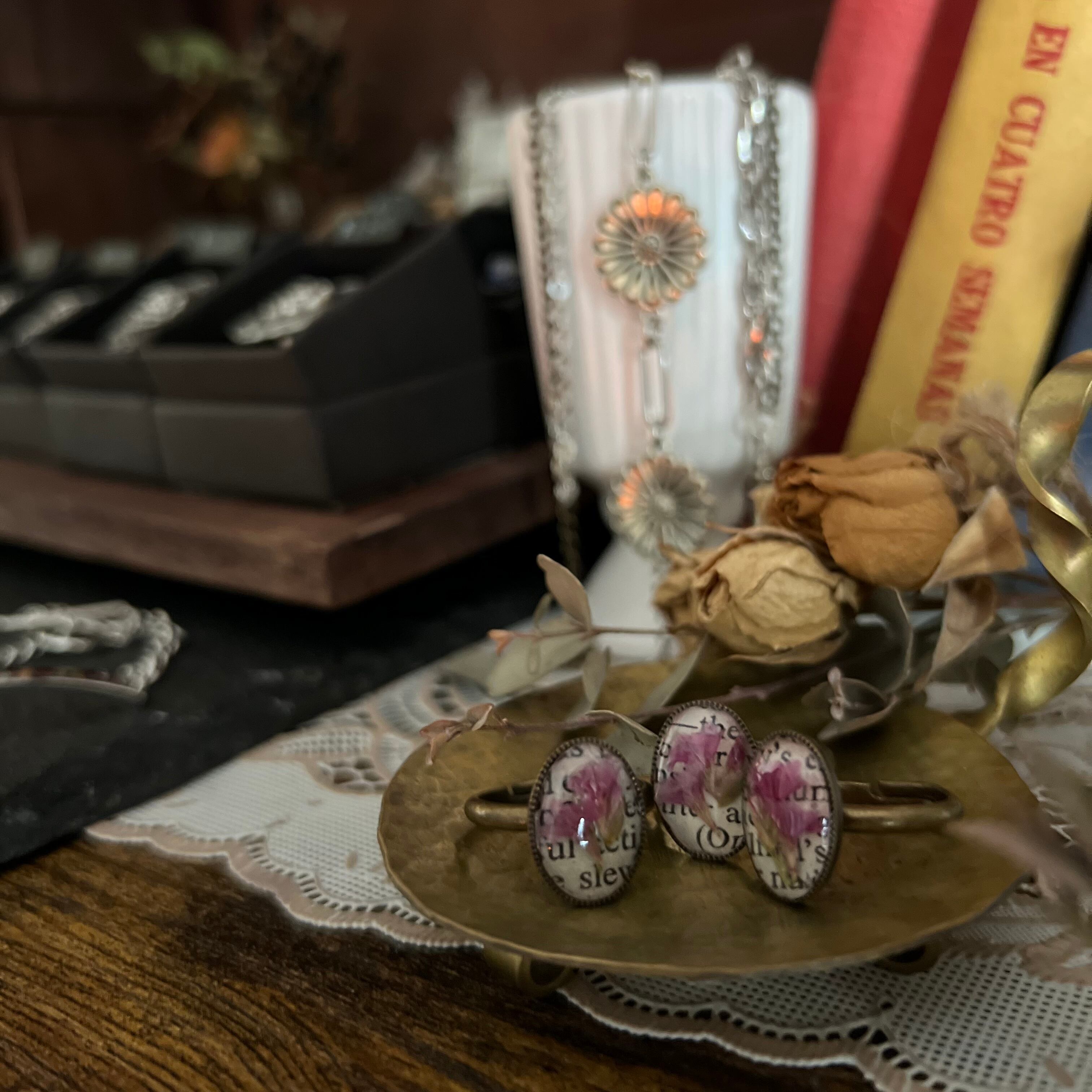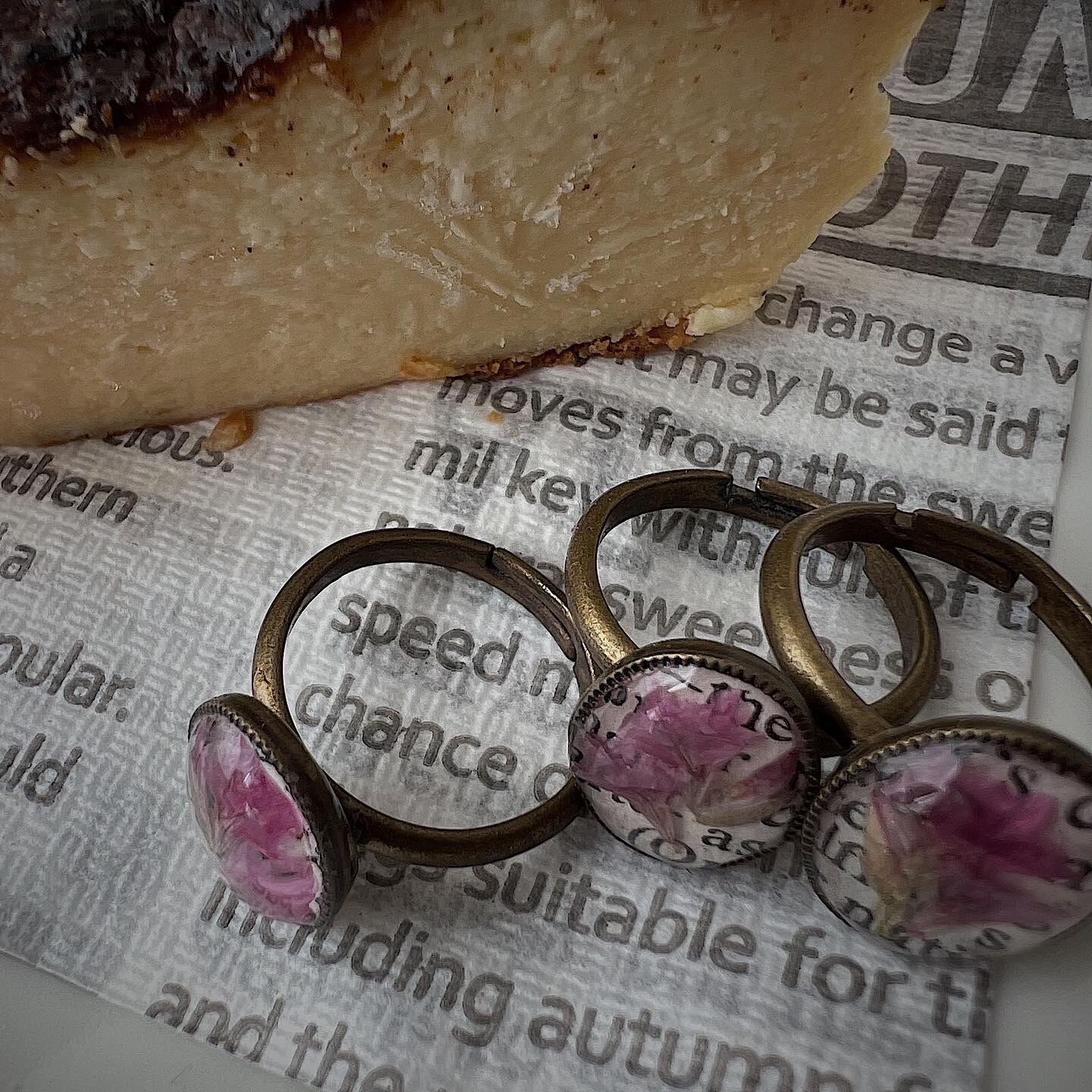 一輪の小花を、そのままの形で洋書の世界に。 植物の標本をそのまま身に着ける特別感をお楽しみください。 金古美カラーは古着コーデとの相性も抜群です。 フリーサイズとなっているので、着ける指にも贈る相手も気にせずにお選びいただけます。 ------ 素材:樹脂 真鍮 ペーパー ドライフラワー 号数:フリー (金具で調節できます)