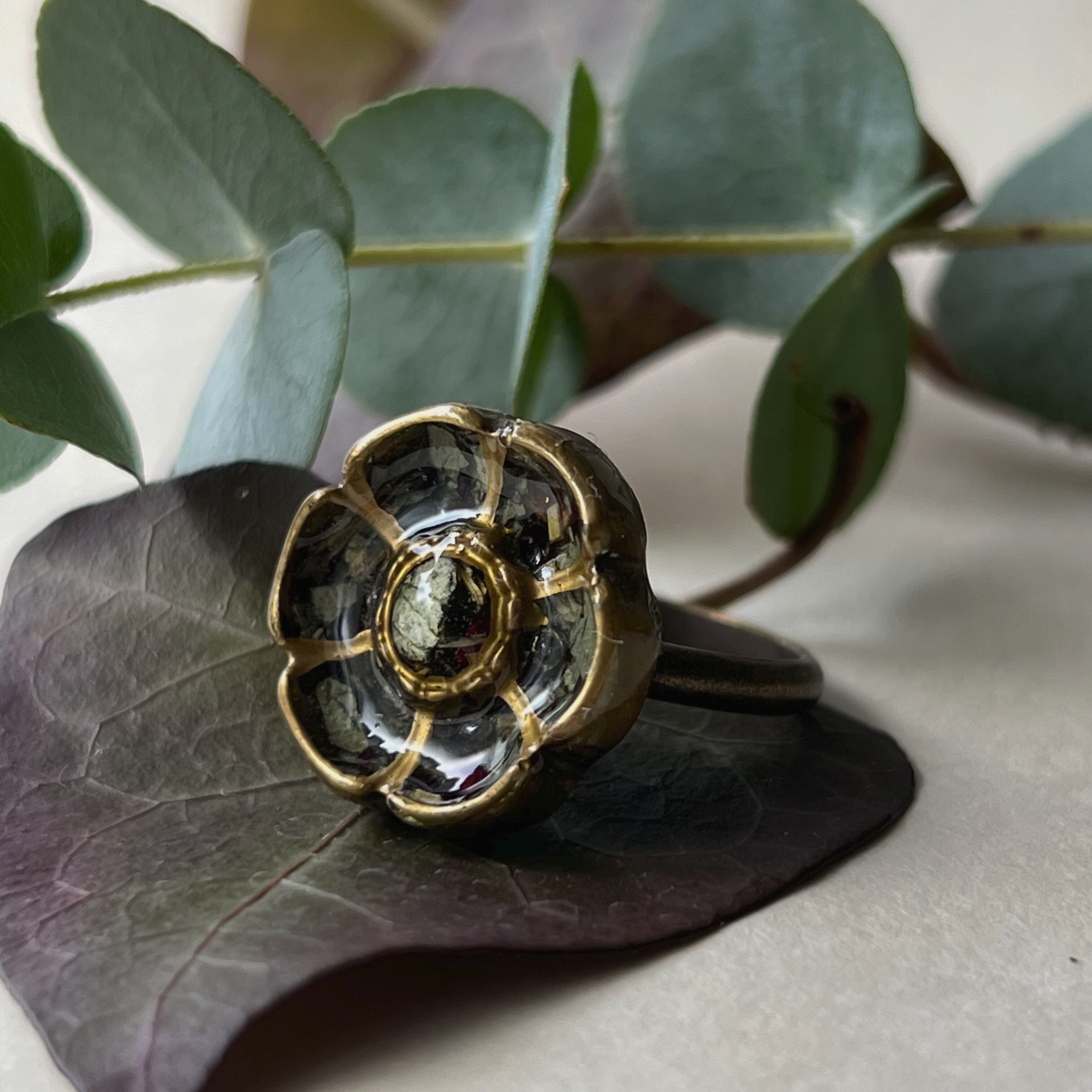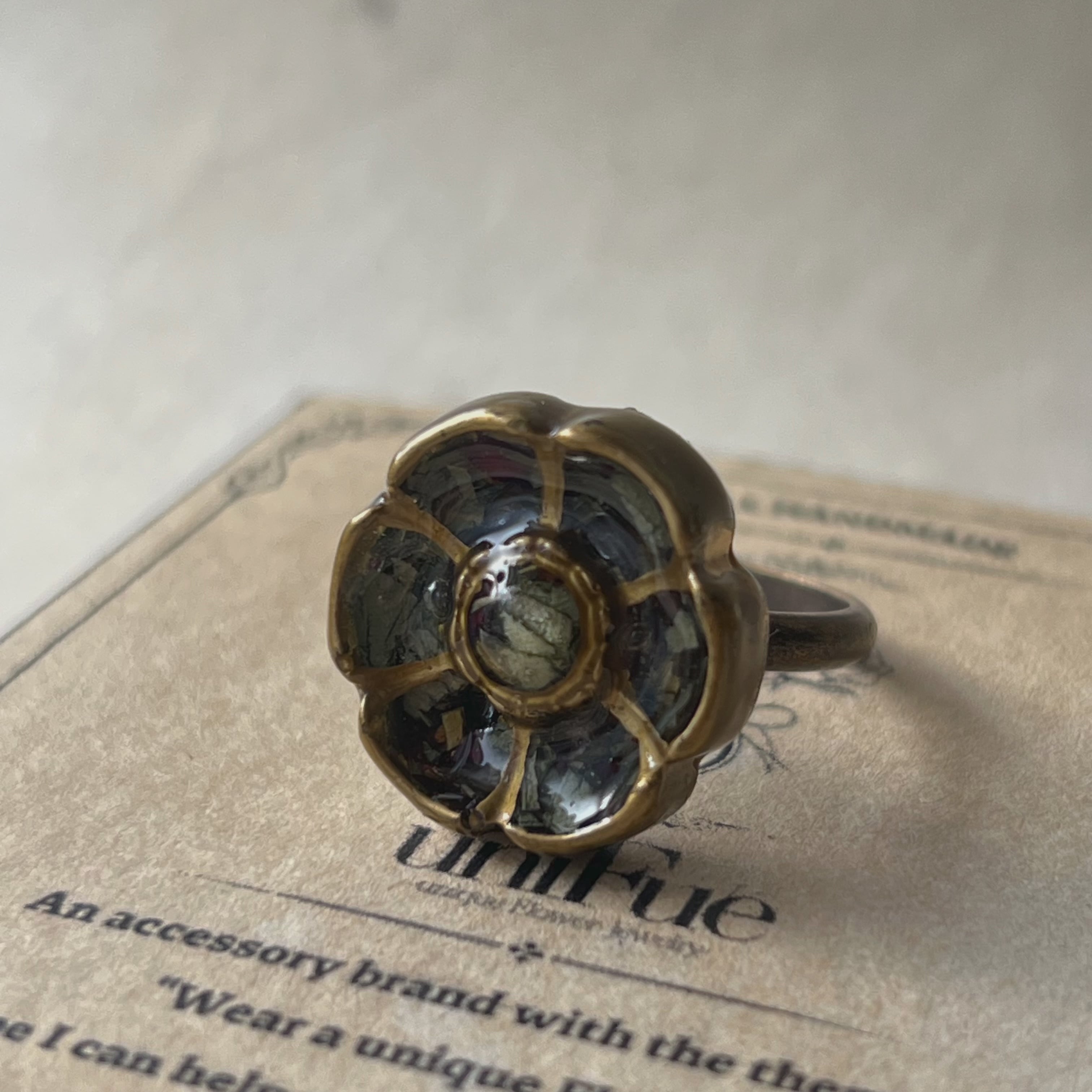 目を惹くフラワーモチーフ、そして落ち着いたグリーンの色合いの指輪